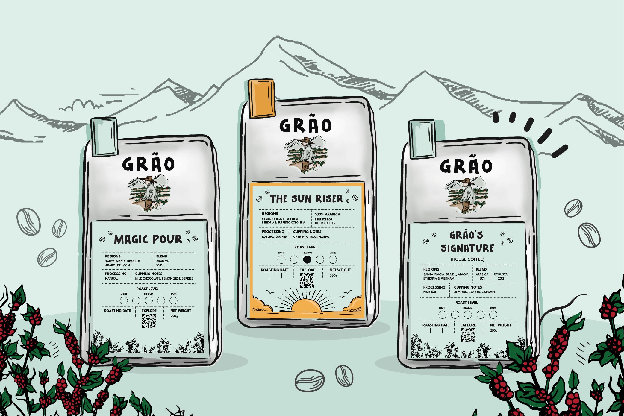 At Grão Coffee Co., blending coffee is a carefully honed craft. Our team works closely with farmers across various regions to source the highest quality beans, ensuring that each blend is made from the best possible ingredients. We offer a variety of blends that cater to different tastes and preferences, from bold, robust options to more delicate, nuanced flavors. Our signature blends include the signature House Coffee, Magic Pour and the new Sunriser.